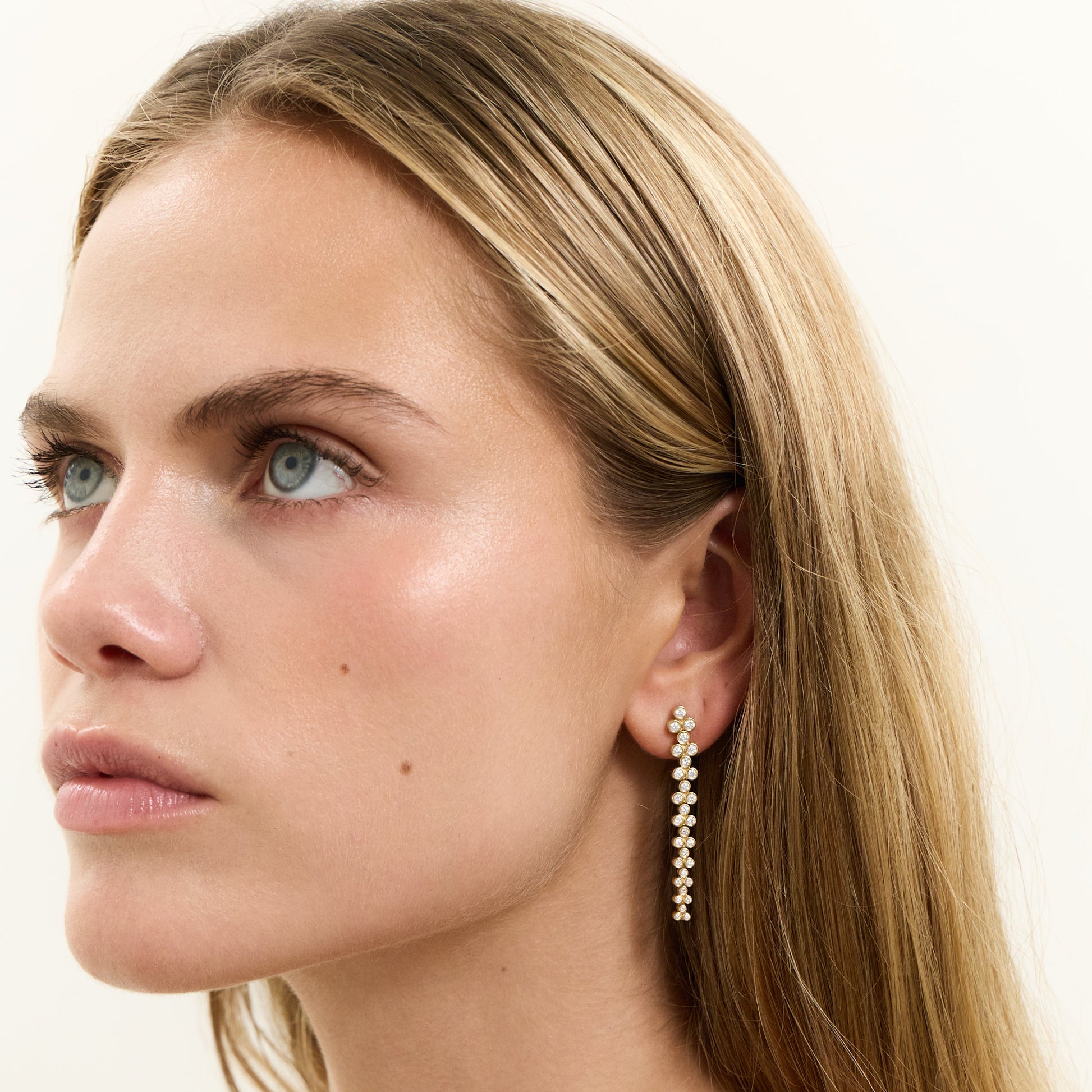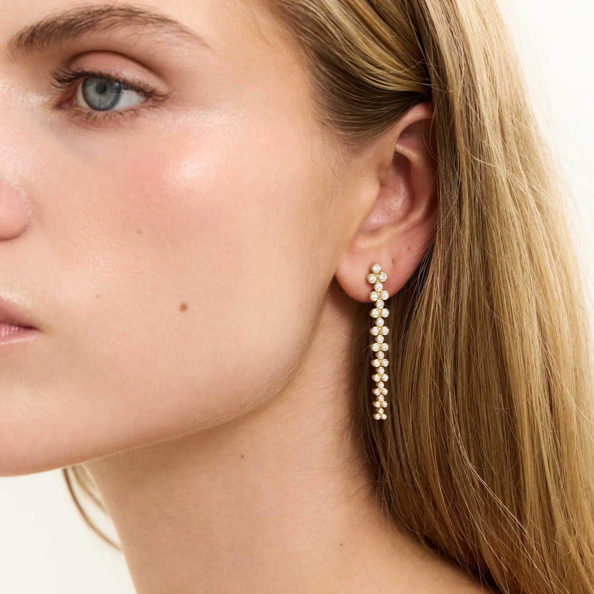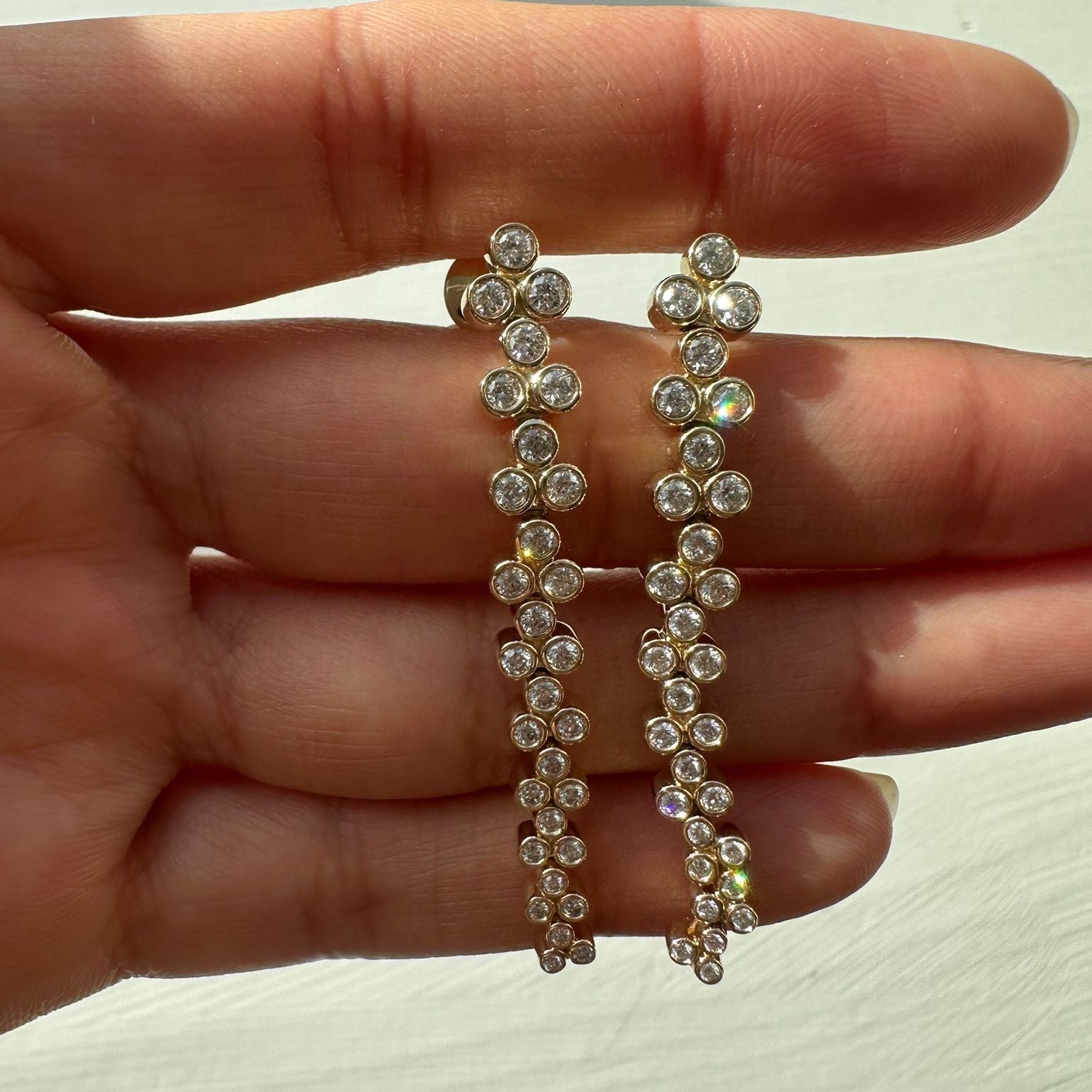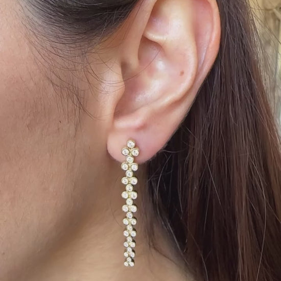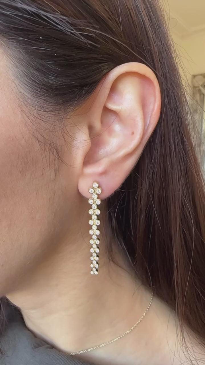 Showcasing the beauty of the raindrops these earrings features graduating diamonds set in bezel setting.